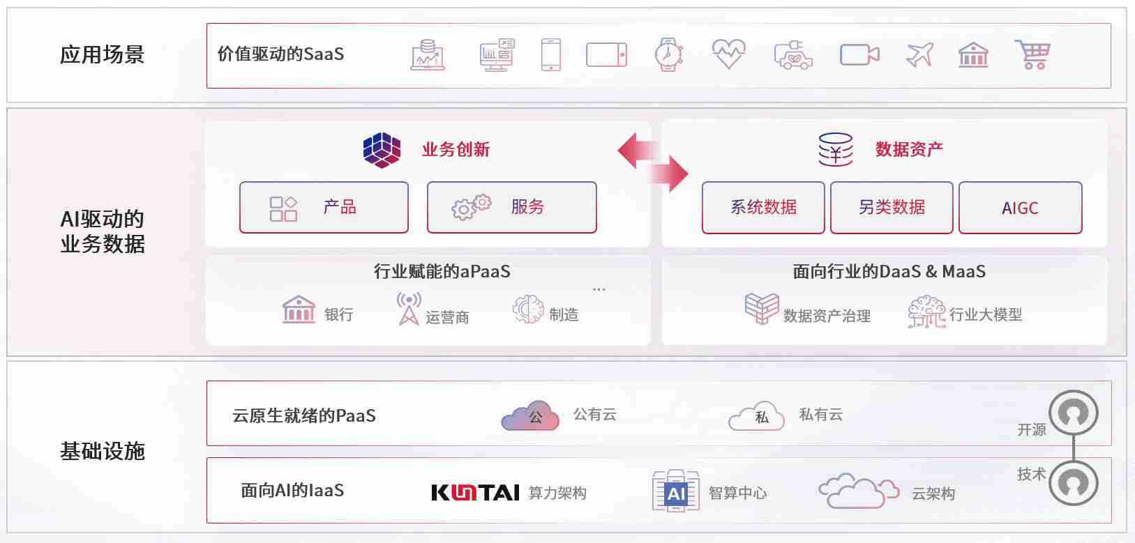 数字时代,,围绕企业数字化转型的关键要素,,,尊龙z6数码开创性的提出数云融合战略和技术体系框架,,,,着力在云原生、、、、数字原生、、、、AI原生和信创产业上架构产品和服务能力,,为处在不同数字化转型阶段的快消零售、、、汽车、、、、金融、、医疗、、、、政企、、教育、、、、运营商等行业客户提供泛在的敏捷IT能力和融合的数据驱动能力,,,构建跨界融合创新的数字业务场景和新业务模式,,,,助力企业级客户建立面向未来的核心能力和竞争优势,,,全面推动社会的数字化、、、、智能化转型升级。。