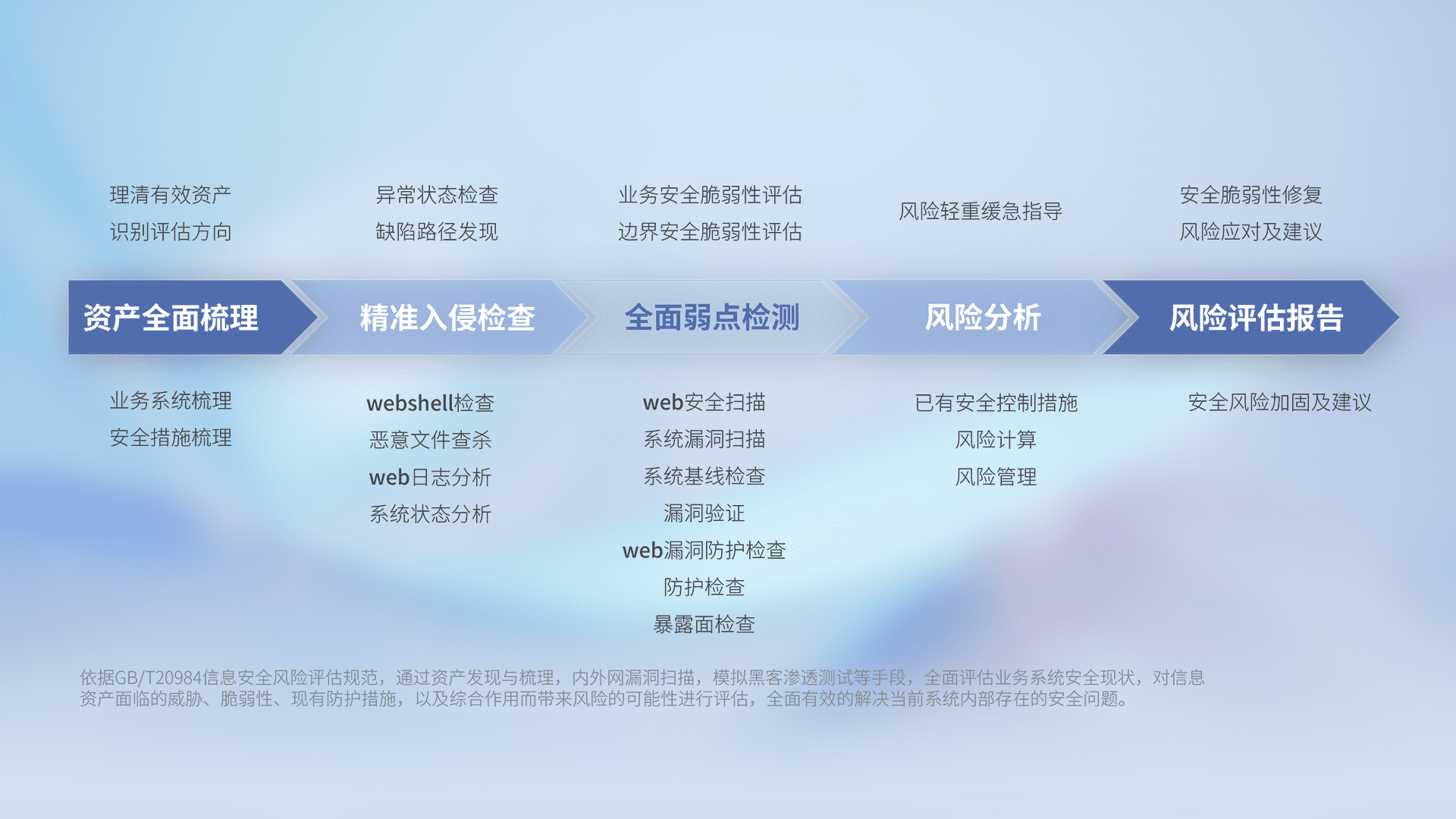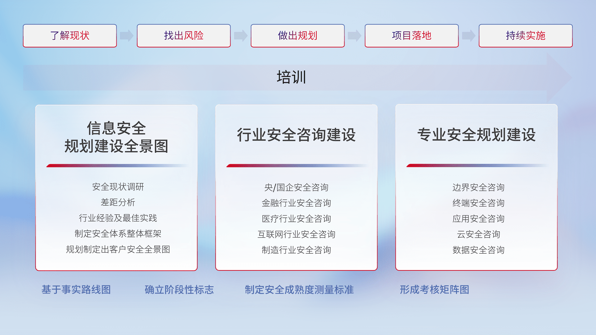 针对客户行业特性,,,以专业的安全服务+多厂商联合解决方案提供专属的一站式安全管理服务,,帮助客户全面感知网络空间威胁,,,基于识别、、、检测、、、、分析、、防护、、、监测、、响应的服务理论模型,,从方案咨询、、集成交付、、评估验证、、、、优化加固、、、运维运营,,,致力于为客户提供完整的闭环管理式安全服务。。以实战经验为客户打造高抵御风险的安全体系,,,帮助客户发现威胁、、、、对抗威胁、、、、处置威胁,,,不断积累安全对抗能力,,,,持续保障数字化安全。。。。